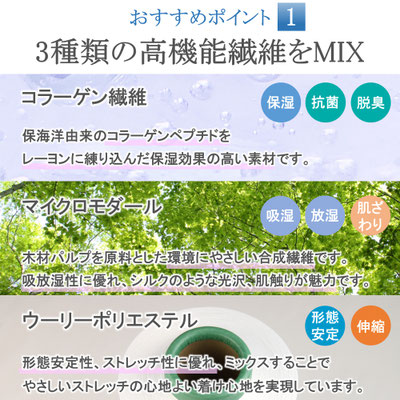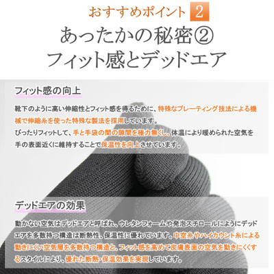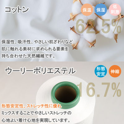 ハイフィラメントカウントの糸と中空糸を合わせて断熱性を向上。ウレタン糸を使った伸縮糸を裏糸に使用し、ぴったりフィットであったかです。