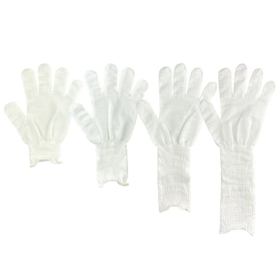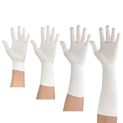 そこで、抗菌コットンのインナー手袋をベースとし、ショート丈(通常丈)を基準に手首の長さを2倍、3倍、4倍の4種類を試作しました。