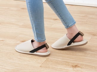 普段はゴムバンドを甲に固定、非常時はかかとに回せる2WAYタイプ。