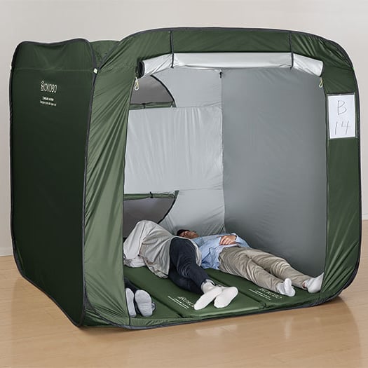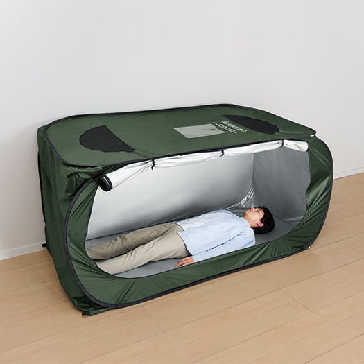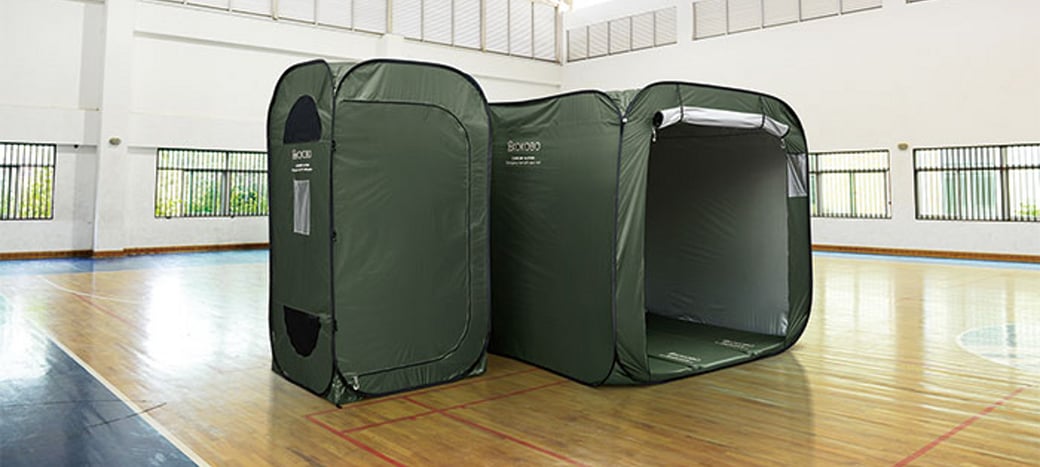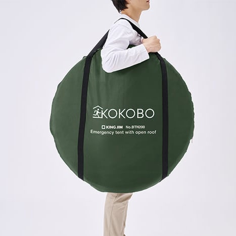 ファスナーで屋根が開けられる防災テント。換気や採光簡単で、大人3人までは入れる広々サイズ。