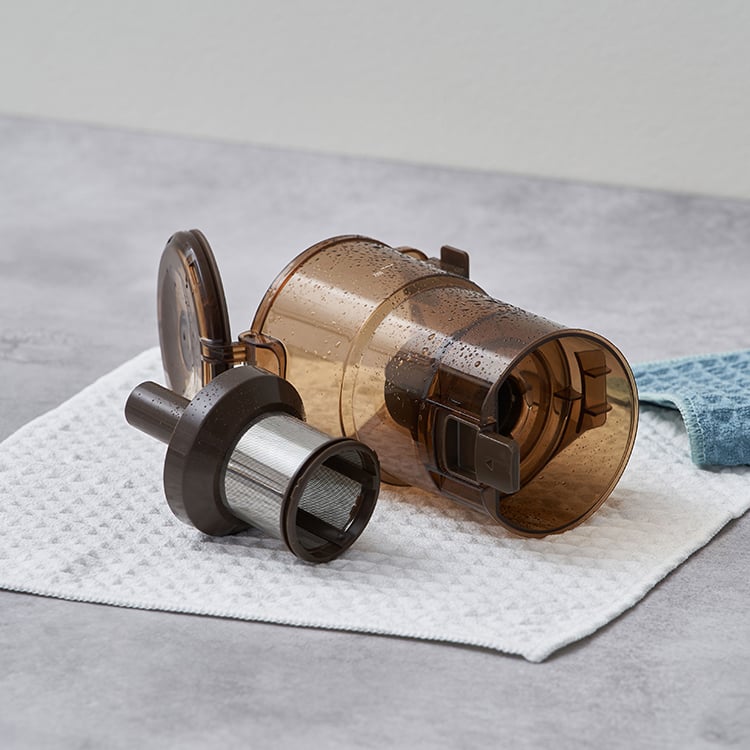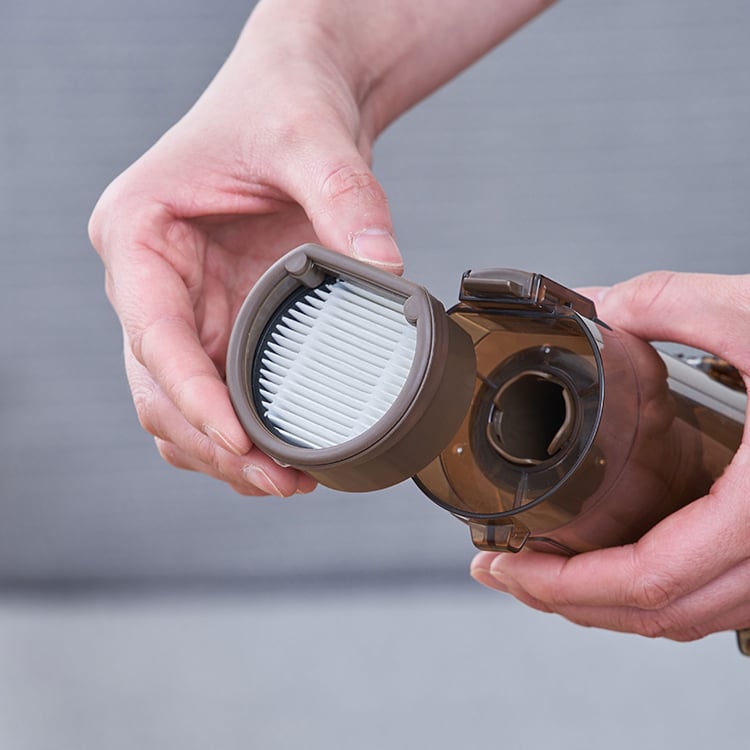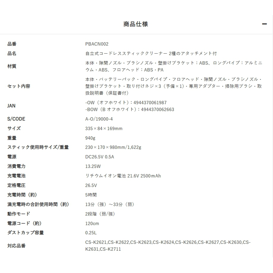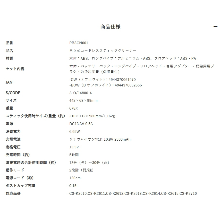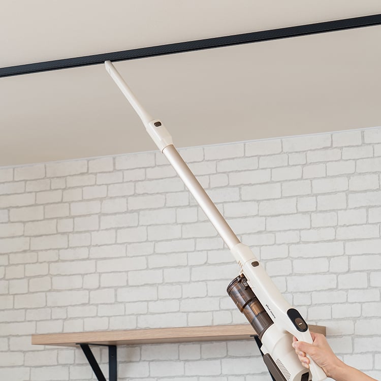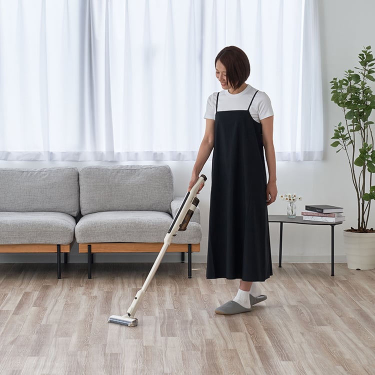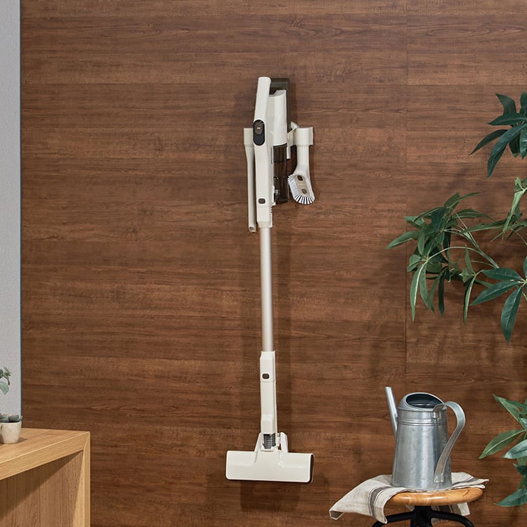 コードレスながらパワフルな吸引力を実現。ヘッドが自動で前へ進む自走式を採用し、掃除の負担や様々なストレスを解消したスティックタイプの軽量クリーナー。真っ直ぐ立つため掃除中もサッと置くことができ、収納も楽々。付属の壁掛け収納用パーツを使用すると、収納がよりコンパクトに。付属の専用2種のアタッチメントは、隙間や家具の掃除に便利です。溜まったごみはふたを開けてごみ箱に捨てるだけと衛生的で手軽な点も◎。